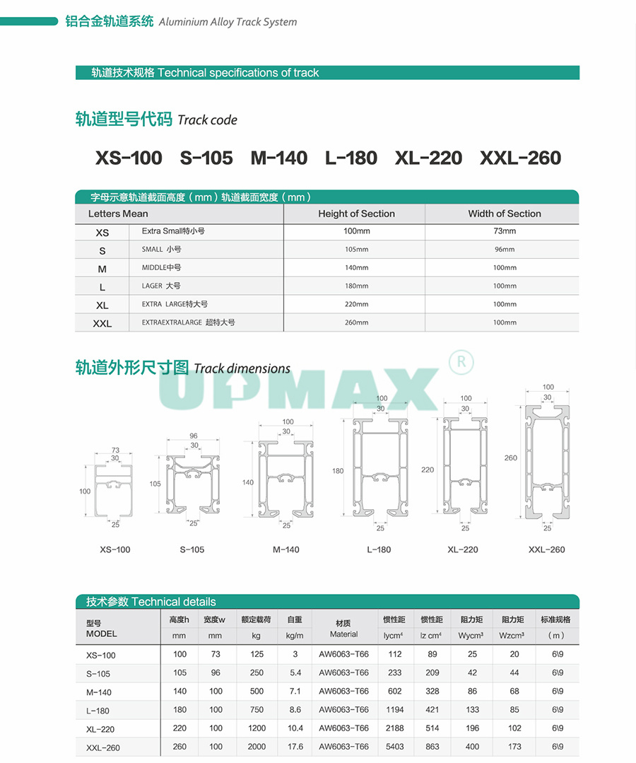 1.铝合金封闭轨道,阳极电镀防腐处理,耐磨性好;